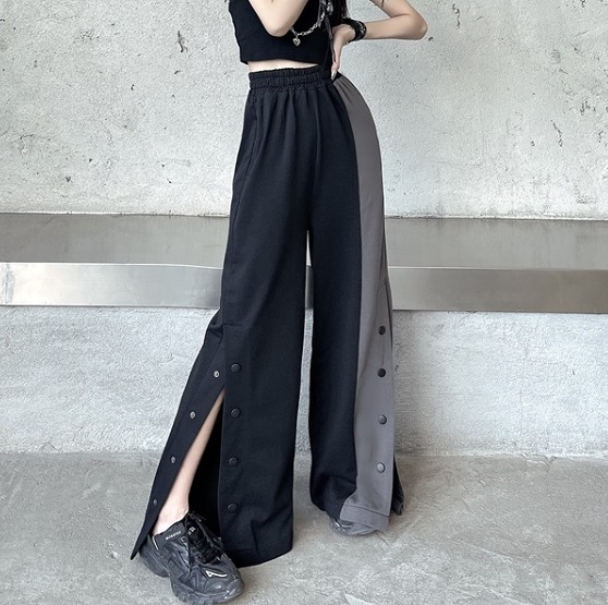 全2色 パンツ ズボン スリット 切り替え バイカラー 配色 体型カバー 原宿系ファッション 韓国風ダンス 衣装 ヒップホップ 個性 奇抜 かわいい 青文字系 ボトムス レディース 女