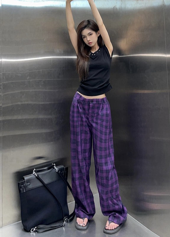 ♪M-2XL展開♪チェックズボンボトムスパンツハイウエストゴムロングシンプル太め大きいサイズゆったりパープル紫ダンス衣装ヒップホップHIPHOPレディースメンズガールズストリート奇抜派手個性的