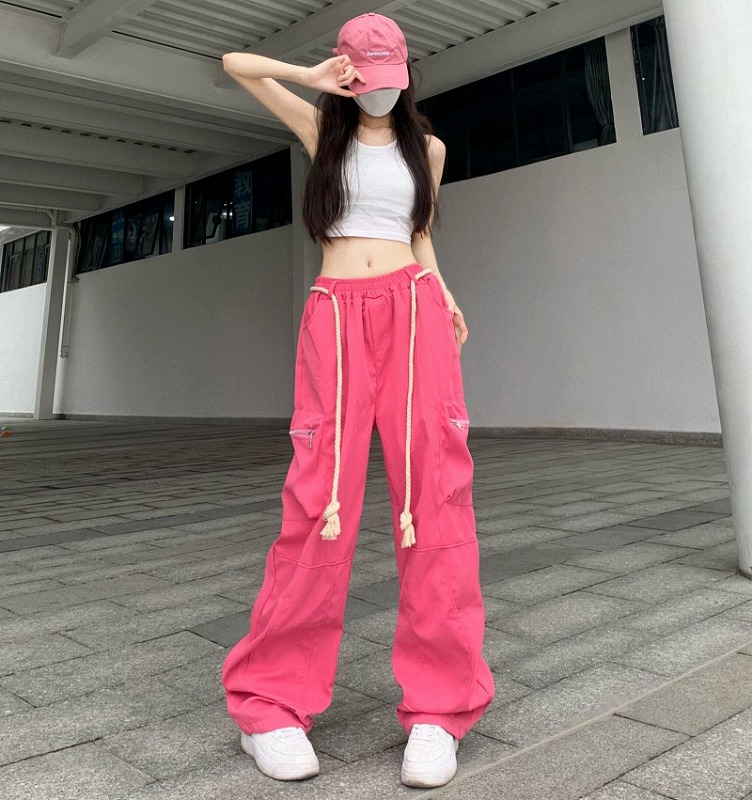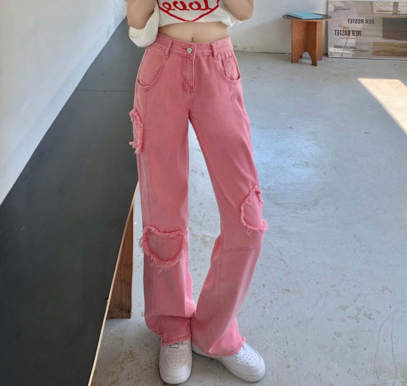 ピンクダメージデニムズボンボトムスパンツジーンズジーパンストレートロングハイウエスト無地シンプルハートフリンジダンス衣装ヒップホップレディースガールズストリート奇抜派手韓国ビッグ大きいサイ