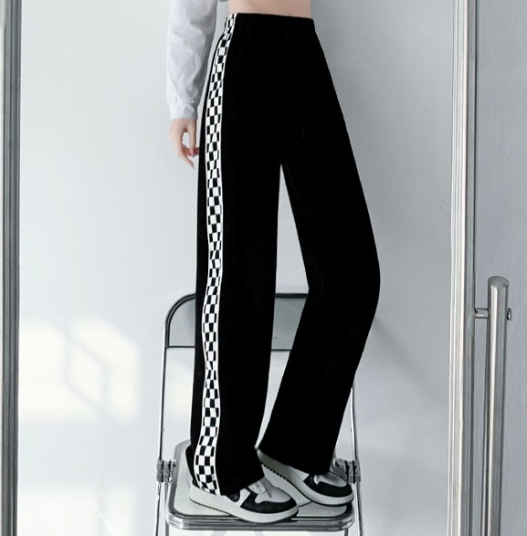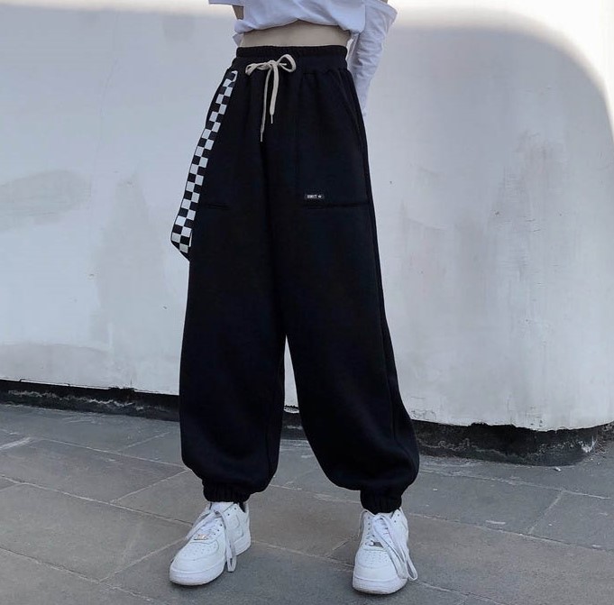 チェックチェーンパンツズボンボトムスジャージ下スウェット黒ブラック無地シンプルゴムハイウエストロングストレートワイド太い大きいゆったりジョガーパンツダンス衣装ヒップホップHIPHOPレディースメンズガ