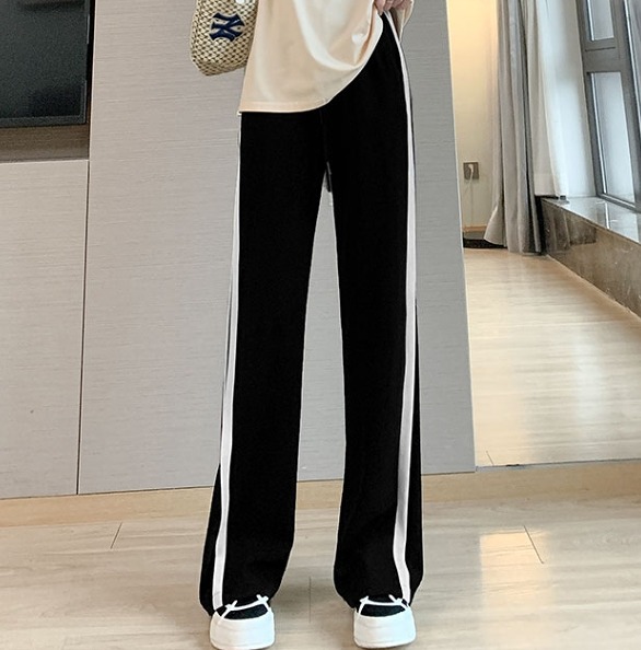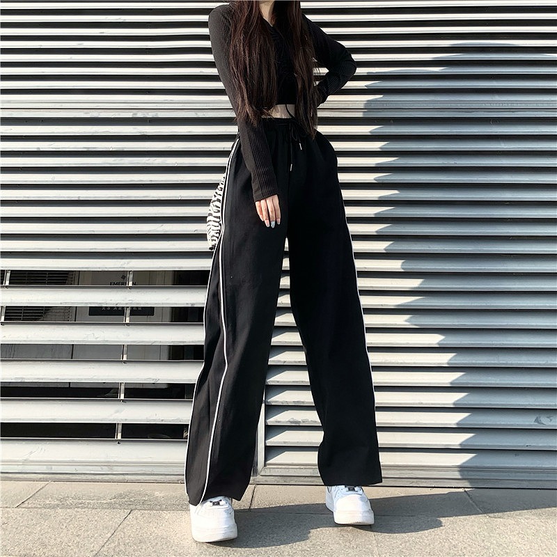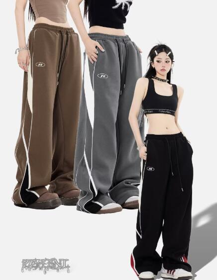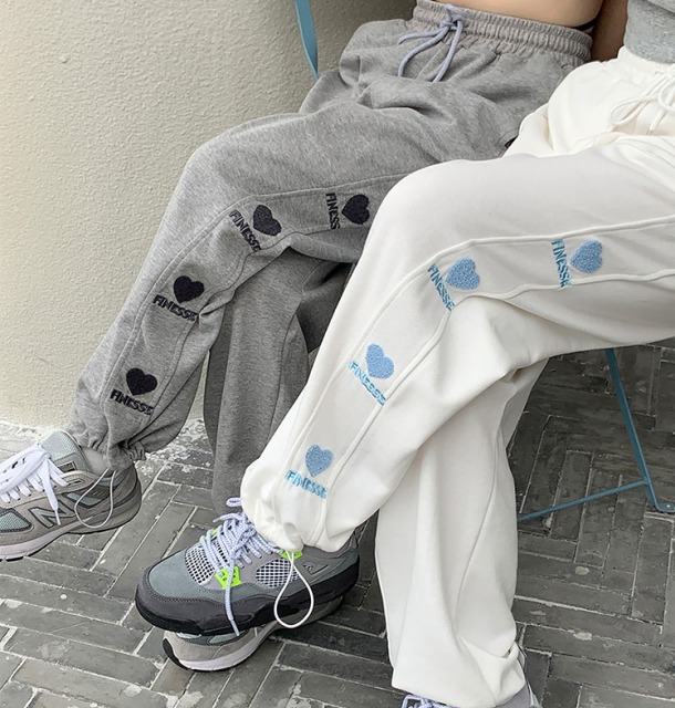 ハートロゴスウェット3色刺繍ジャージロングゴムズボンボトムスパンツストレート太い大きいサイズワイドビッグジョガーパンツダンス衣装ヒップホップレディースガールズ韓国おしゃれ白黒グレーストリー