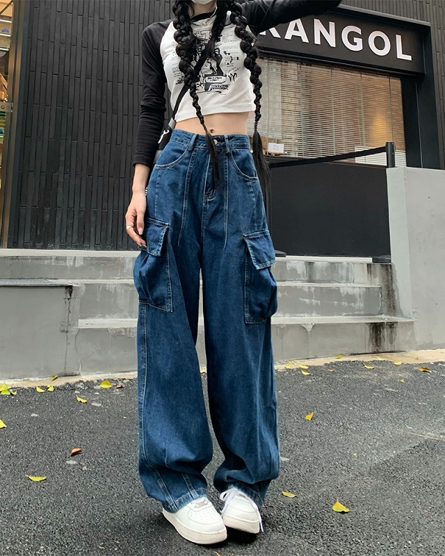 全2色 パンツ ズボン ハイウエスト 切り替え 体型カバー デニム 原宿系ファッション 韓国風 ダンス 衣装 ダンサー ヒップホップ 個性 奇抜 かわいい 青文字系 ボトムス レディース