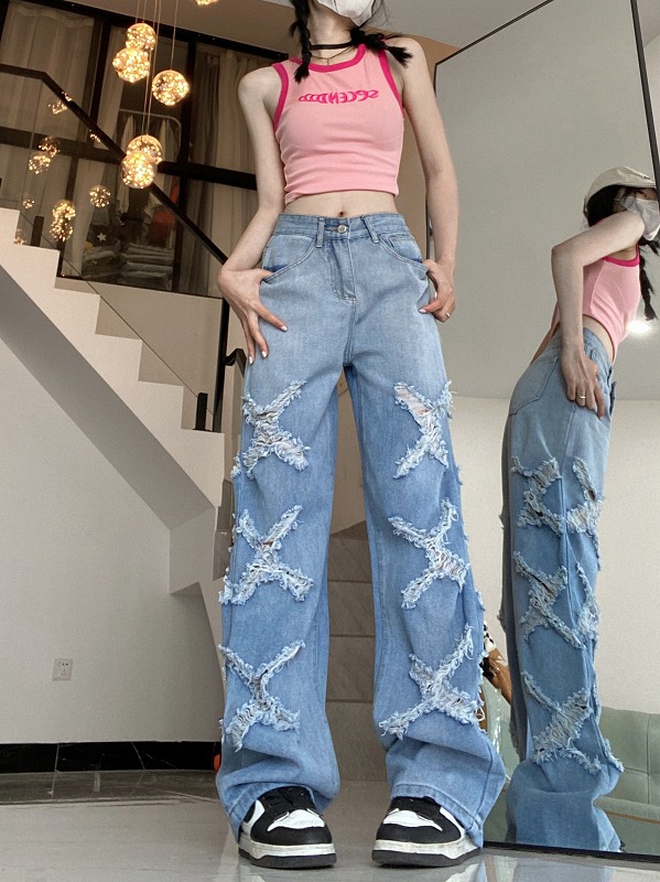 ♪S~XL展開♪ピンクダメージデニムズボンボトムスパンツジーンズジーパンストレートロングハイウエストシンプル星柄フリンジダンス衣装ヒップホップHIPHOPレディースガールズストリート奇抜派手韓国ビッグ