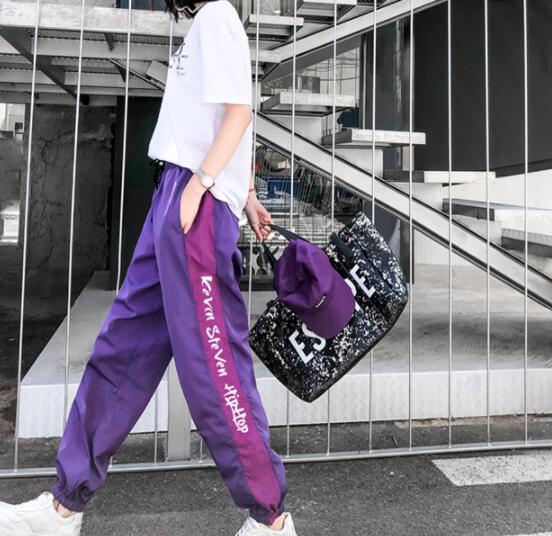 パンツ ズボン 薄手 ハイウエスト 英字 ロゴ ヒップホップ ゆったり 韓国 ダンス 衣装 ボトムス レディース メンズ ガールズ ロゴ ライン 紫 パープル ゴム ジャージ