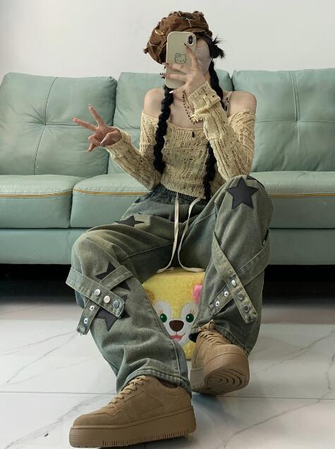 ♪-展開♪ジーンズジーパン パンツズボンボトムス星柄ベルトポケットデニムダンス衣装ヒップホップレディースメンズガールズストリート大きいサイズかっこいい個性的韓国ファッション