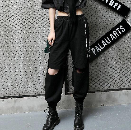 2チェーンデニムジーンズジーパンパンツズボンボトムスロング太いストレートショートパンツショーパン無地シンプルダンス衣装ヒップホップレディースガールズ韓国個性的奇抜派手セクシー肌見せ