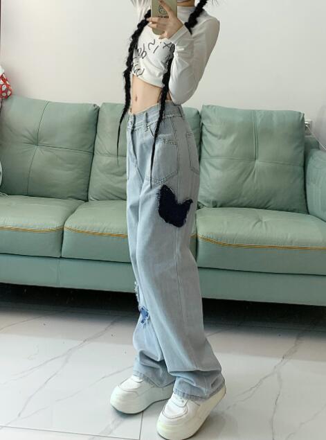 ハートデニムパンツロング長ズボンズボンロングジーンズボトムスレディースガールズハイウエストストレート韓国総柄ダンス衣装ヒップホップ派手個性的刺繍大きい青ブルーレトロヴィンテージ風ゆったり