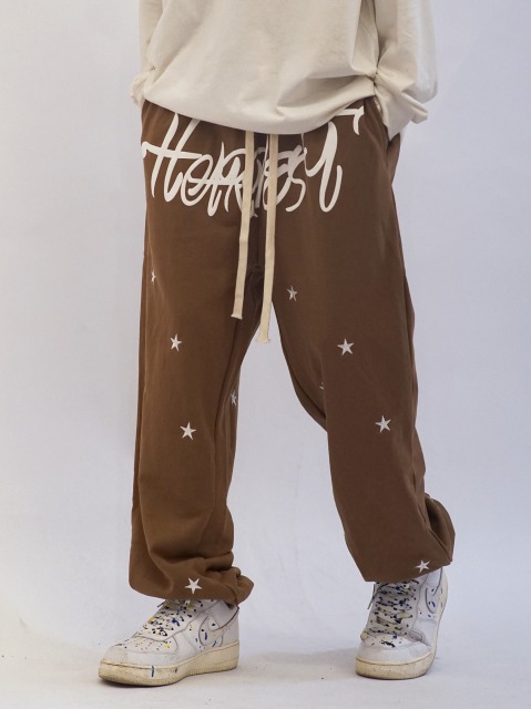 星柄パンツ2色ズボンボトムスジャージスウェット下ゴムロングワイド太い大きいサイズビッグゆったり黒ブラックブラウンロゴスタージョガーパンツ絞りダンス衣装ヒップホップHIPHOPレディースメンズガールズ奇