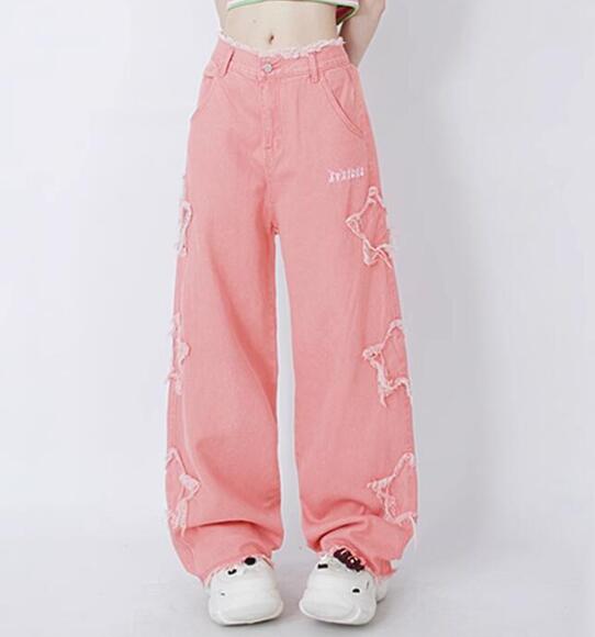 ♪~展開♪ピンクダメージデニムズボンボトムスパンツジーンズジーパンストレートロングハイウエストシンプル星柄フリンジダンス衣装ヒップホップレディースガールズストリート奇抜派手韓国ビッグ