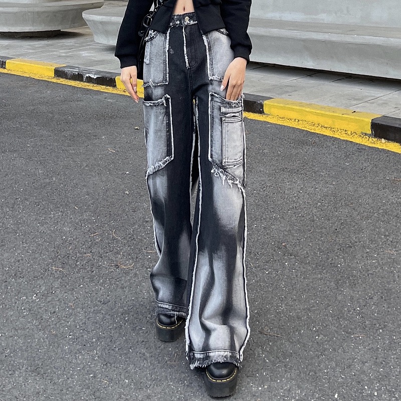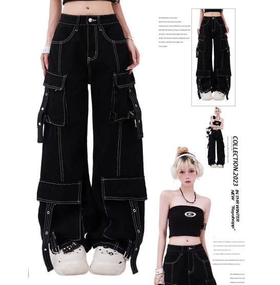 ♪S-XL展開♪カーゴパンツジーンズジーパン パンツズボンボトムスポケットブラック黒デニムダンス衣装ヒップホップHIPHOPレディースメンズガールズストリート大きいサイズかっこいい個性的韓国ファッショ