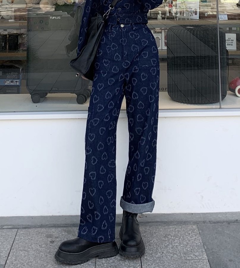 ハートデニムパンツロング長ズボンズボンロングジーンズボトムスレディースガールズハイウエストストレート韓国総柄ダンス衣装ヒップホップHIOPHOP派手個性的刺繍大きい青ブルーレトロヴィンテージ風ゆったり
