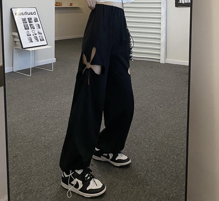 フラワー穴あきパンツズボンボトムスジャージスウェット黒ブラック無地シンプルハイウエストゴムロングストレートワイドジョガーパンツダンス衣装ヒップホップHIPHOPレディースガールズストリート韓国フラワー