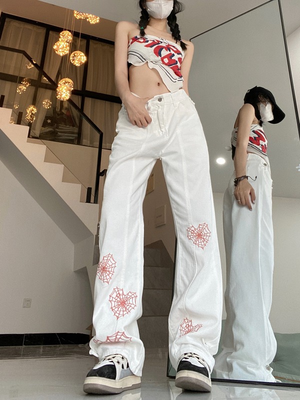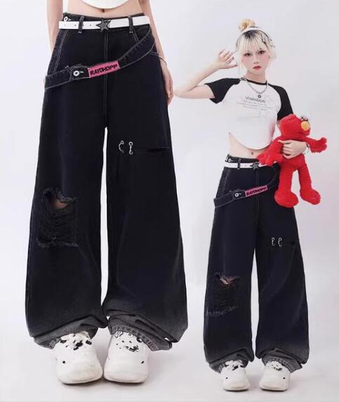 ♪~展開♪ダメージデニムズボンボトムスパンツジーンズジーパンストレートロングハイウエスト無地シンプルダンス衣装ヒップホップレディースガールズストリート奇抜派手韓国ビッグ大きいサイズ