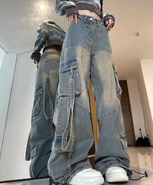 ♪S-XL展開♪カーゴパンツジーンズジーパン パンツズボンボトムスポケットベルトデニムダンス衣装ヒップホップHIPHOPレディースメンズガールズストリート大きいサイズかっこいい個性的韓国ファッション