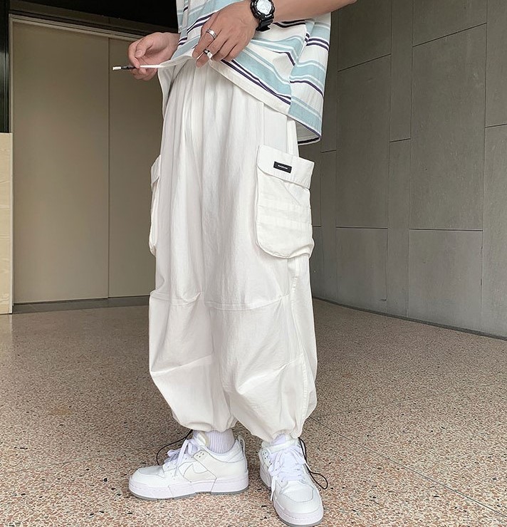 ワイドパンツ3色ズボンボトムスジャージゴム太い太めロング絞りポケット無地シンプル黒ブラック白ホワイト緑グリーンミリタリーダンス衣装ヒップホップレディースメンズ個性的奇抜