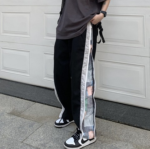 パンツ ズボン スリット 切り替え バイカラー 配色 体型カバー デニム ロゴ 英字 大きいサイズあり 原宿系ファッション 韓国風ダンス 衣装 ヒップホップ 個性 奇抜 かわい