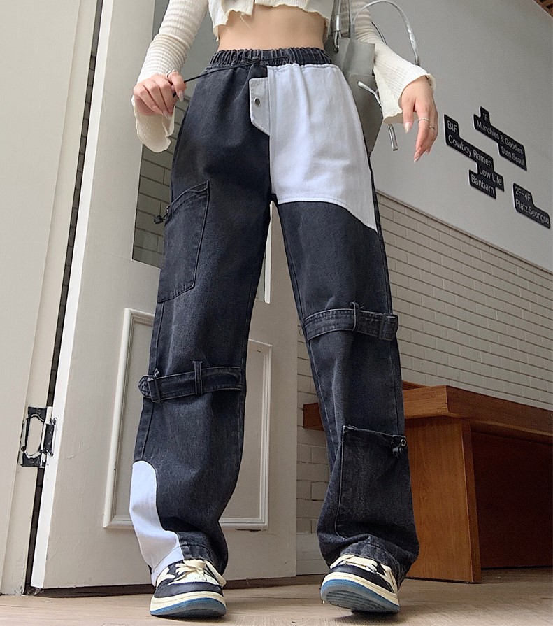 全2色 パンツ ズボン 切り替え 体型カバー デニム 大きいサイズあり ユニセックス 男女兼用 原宿系ファッション 韓国風 ダンス衣装 カワ 個性 奇抜 かわいい 青文字系 ボトムス レディー