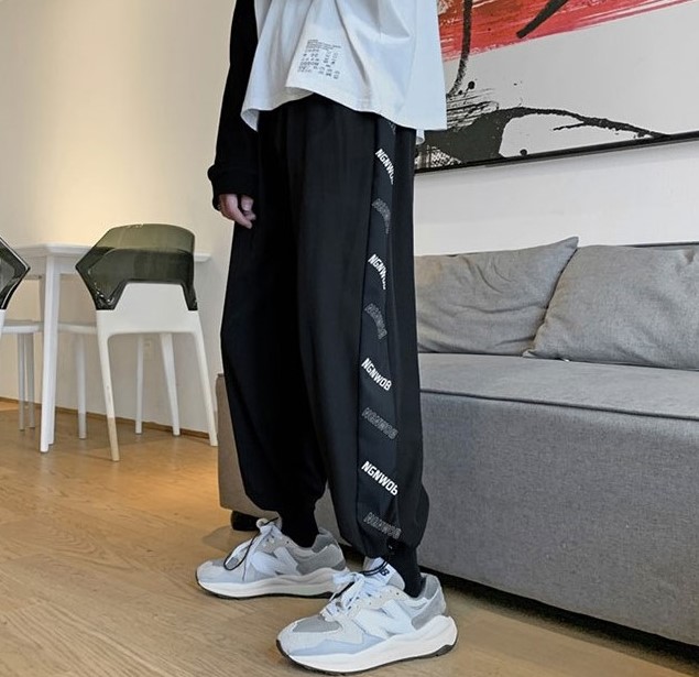 ロゴラインパンツ2色ズボンボトムスジャージゴムハイウエスト太い太めおおきいサイズビッグゆったりグレー黒ブラックジョガーパンツ絞りダンス衣装ヒップホップレディースメンズガールズ個性的奇抜シン