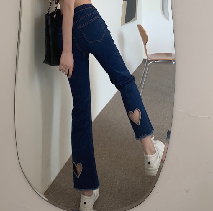 ハートフリンジデニムジーンズジーパンパンツズボンボトムスロングハイウエストスキニー青ブルーストレートダンス衣装ヒップホップHIPHOPレディースガールズストリート個性的奇抜おしゃれ韓国可愛い服下大人