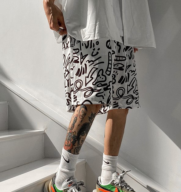 ロゴハーフパンツ2色ズボンパンツズボン半ズボン膝上ゴム黒ブラック白ホワイトモノクロデザイン柄パンツショートパンツダンス衣装ヒップホップレディースメンズガールズ大人ストリート個性的奇抜ジャー