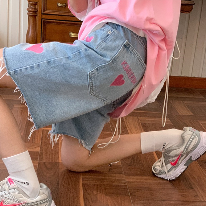 ハート刺繍ロゴパンツ3色デニムジーンズジーパンパンツボトムスズボン半ズボンハーフパンツ膝上切りっぱなし青ブルーひざ丈ダンス衣装ヒップホップレディースガールズ服ストリートハーフパンツショート