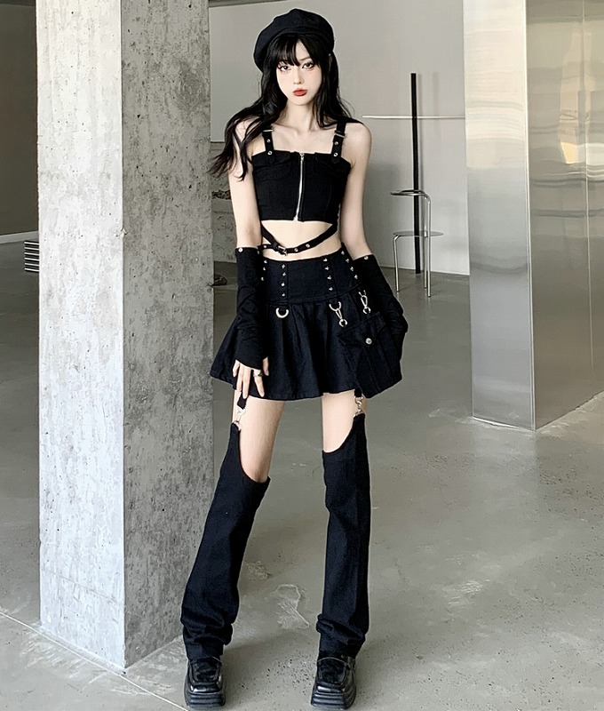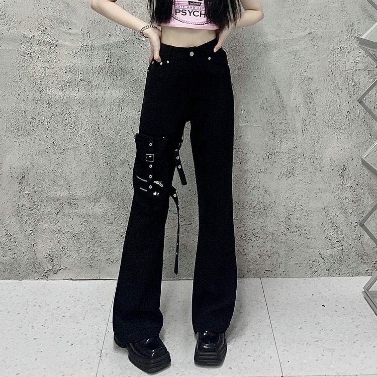 パンツ ズボン ハイウエスト 切り替え スリム デニム スタッズ リベット付 原宿系ファッション 韓国風ダンス 衣装 ヒップホップ 個性 奇抜 かわいい 青文字系 ボトムス レディース