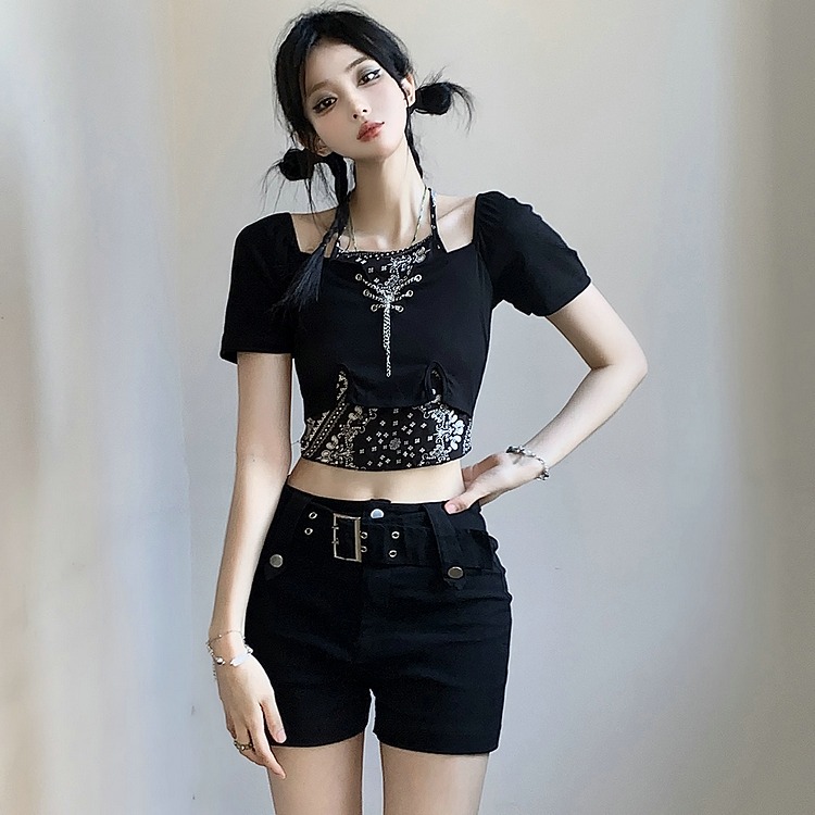 ショートパンツ ショーパン ハーフ ホットパンツ ズボン ハイウエスト 切り替え スリム 無地 原宿系ファッション 韓国風ダンス 衣装 ヒップホップ HIPHOP 個性 奇抜 かわいい 青文字系 ボト