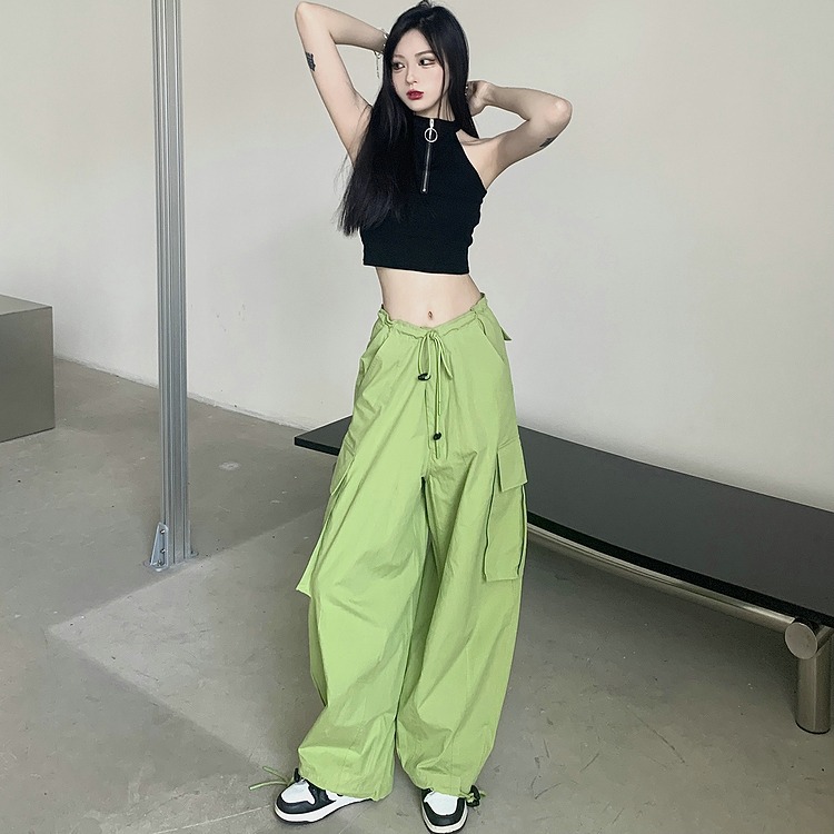 ワイドカーゴパンツズボンボトムスパンツハイウエスト絞りロングジョガーパンツ無地シンプル大きいサイズゆったりだぼだぼダンス衣装ヒップホップHIPHOPレディースメンズストリート奇抜派手