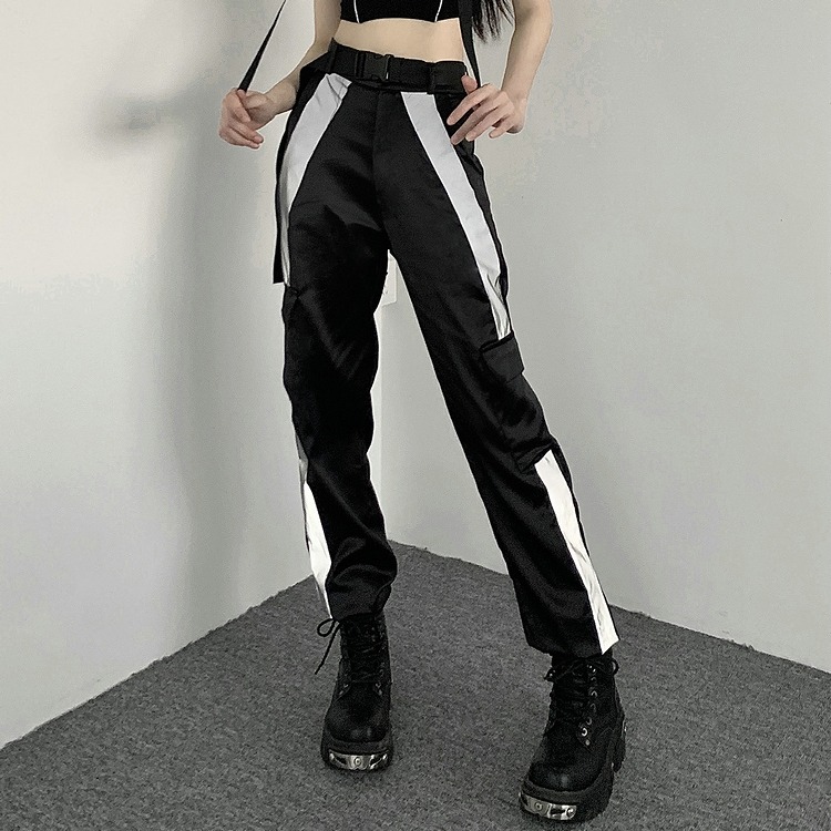 パンツ ズボン ハイウエスト 切り替え バイカラー 配色 スリム ベルト付き ベルト付き 原宿系ファッション 韓国風 ダンス 衣装 ダンサー ヒップホップ 個性 奇抜 かわいい 青文字系