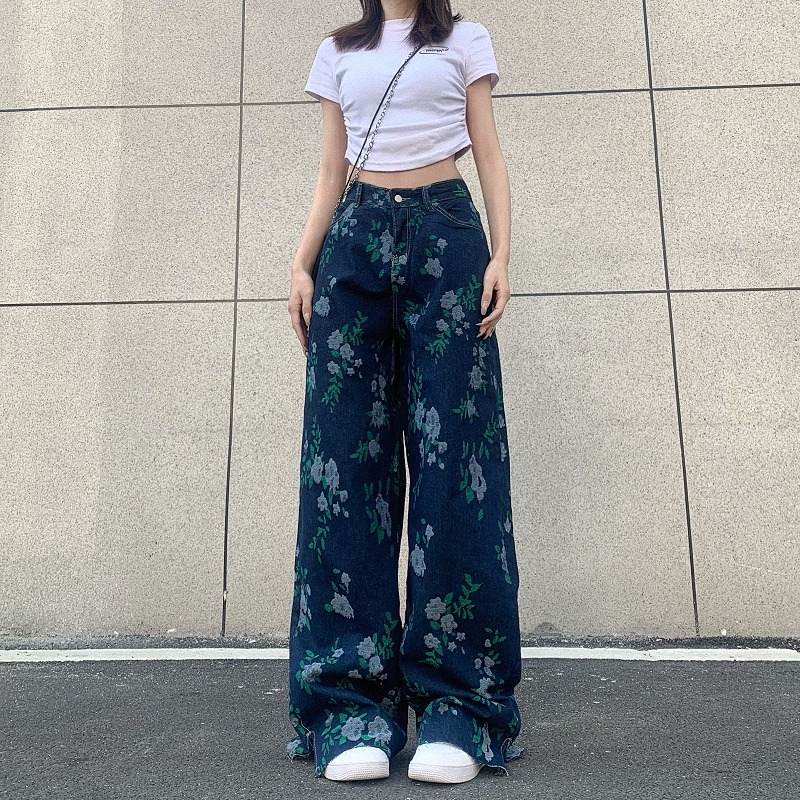 パンツ ズボン プリント 切り替え 体型カバー ガウチョパンツ ワイド バギーパンツ デニム ヴィンテージ風 レトロ調 大きいサイズあり 原宿系ファッション 韓国風 ダンス 衣装 ダンサー ヒップホッ