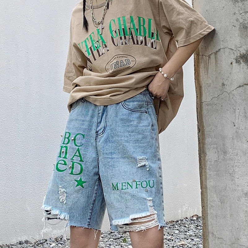 ショート ハーフパンツ ズボン 切り替え 体型カバー デニム 大きいサイズあり 原宿系ファッション 韓国風 ダンス 衣装 ダンサー ヒップホップ 個性 奇抜 かわいい 青文字系 ボトムス