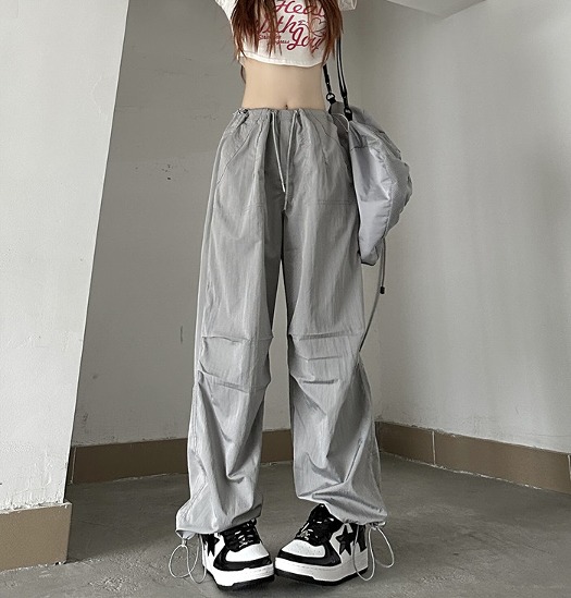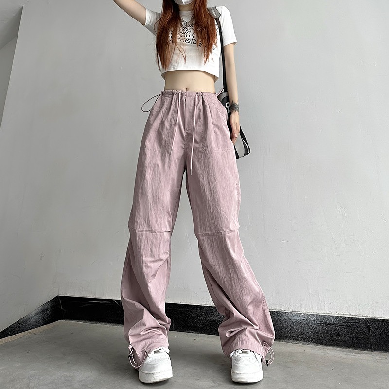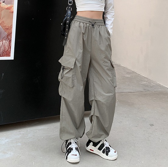ワイド カーゴパンツ 4色 ズボン ボトムス パンツ ジャージ ハイウエスト ゴム ロング ジョガーパンツ ブラック ピンク グレー カーキ 絞り シンプル 大きいサイズ ゆったり だぼだぼ ダンス