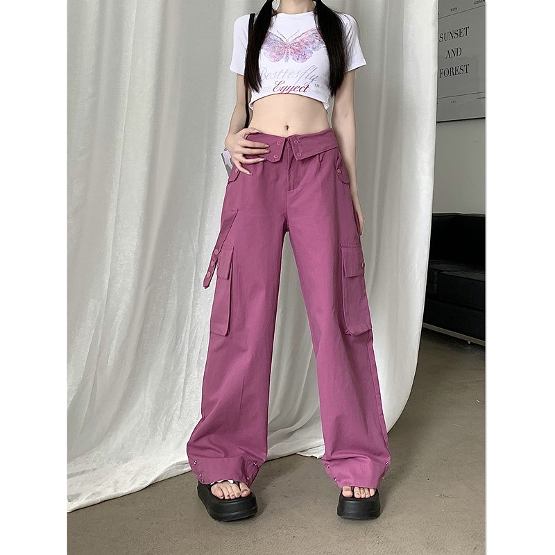 ~カーゴパンツパンツズボンボトムスパープル紫色ポケットレトロダンス衣装ヒップホップレディースガールズストリート無地カジュアル個性ボタン