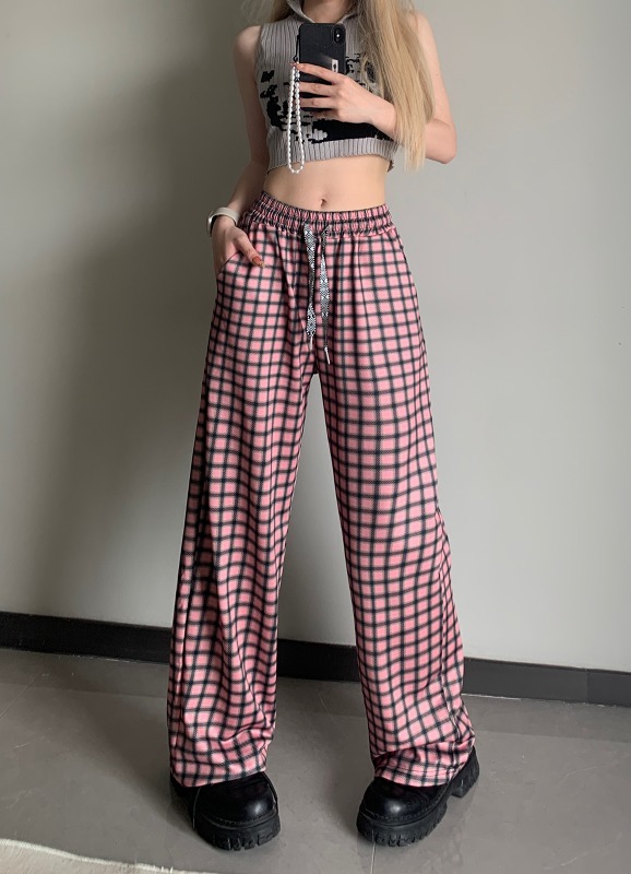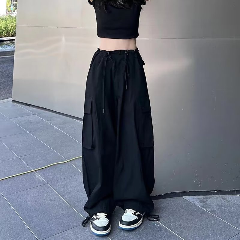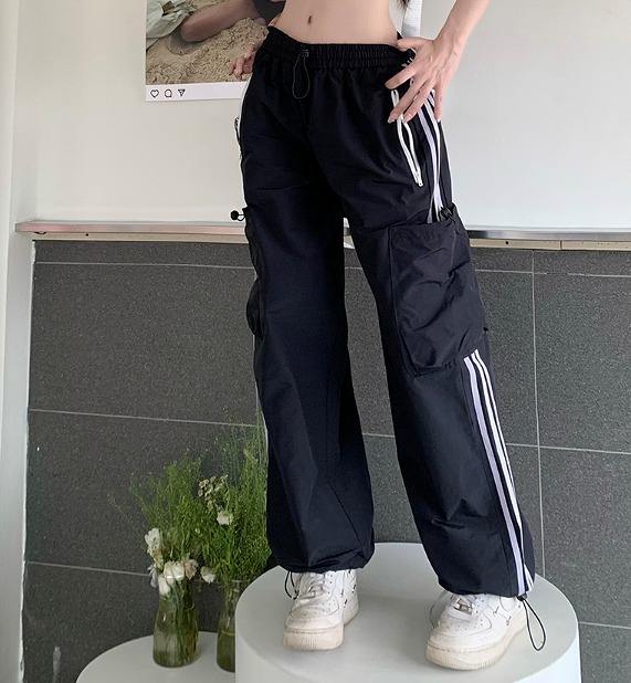 全2色 ワイドカーゴパンツ2色ラインズボンボトムスパンツジャージハイウエストゴムロングジョガーパンツ絞りシンプル大きいサイズゆったりだぼだぼダンス衣装ヒップホップストリート奇抜派手韓国