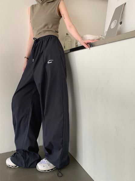 ♪S~2XL展開♪3色パンツズボンボトムスジャージスウェットゴムハイウエストロングワイド太いストレート大きいサイズビッグゆったりロゴブラックグレーブルーダンス衣装ヒップホップHIPHOPレディースメン
