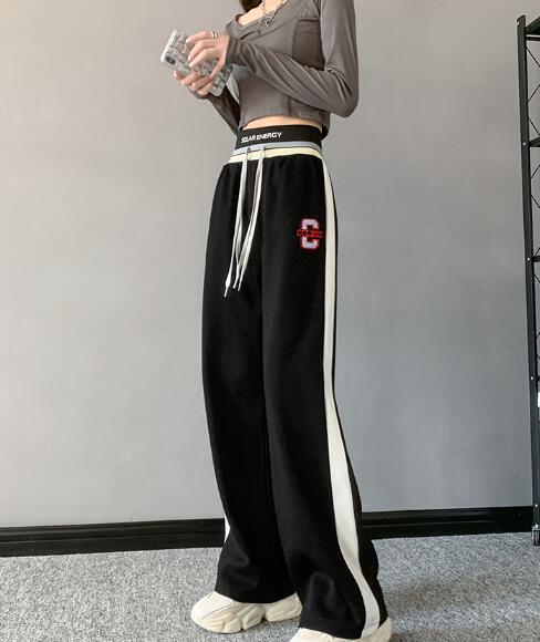 ♪S-2XL展開♪2カラーパンツズボンボトムススウェット ロング大きいサイズブラックホワイトボーダービッグゆったりハイウエストポケットダンス衣装ヒップホップHIPHOPレディースガールズ個性的奇抜韓国