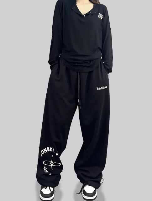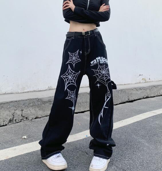 くもプリントデニムズボンボトムスパンツジーンズジーパンストレートロングハイウエストシンプルダンス衣装ヒップホップレディースガールズストリート奇抜派手韓国ビッグ大きいサイズ