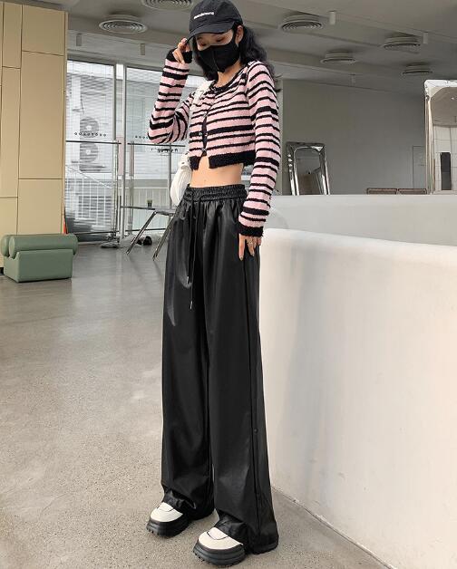 パンツズボンボトムスレザースウェット ロングワイド太い太め大きいサイズビッグゆったりハイウエストゴムポケットダンス衣装ヒップホップレディースメンズガールズ個性的奇抜かっこいい