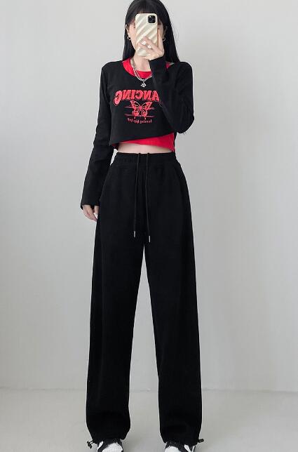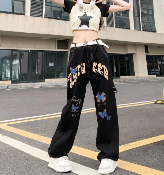 ♪ちょうちょプリントデニムズボンボトムスパンツジーンズジーパンストレートロングハイウエストシンプルダンス衣装ヒップホップレディースガールズストリート奇抜派手韓国ビッグ大きいサイズ