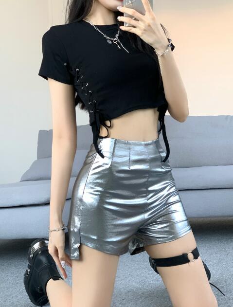 ショートパンツシルバーズボンパンツボトムス膝上ハイウエストダンス衣装ヒップホップHIPHOPレディースガールズストリートセクシーステージ奇抜派手個性的 韓国ファッション