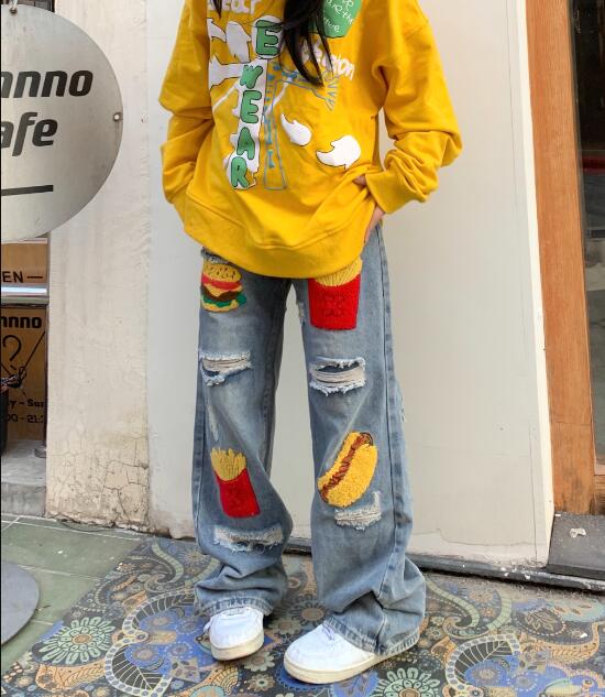 デニムズボンボトムスパンツジーンズジーパンストレートハンバーグ食べ物ダメージ加工シンプルダンス衣装ヒップホップHIPHOPレディースメンズガールズストリート奇抜派手韓国ビッグ大きいサイズ