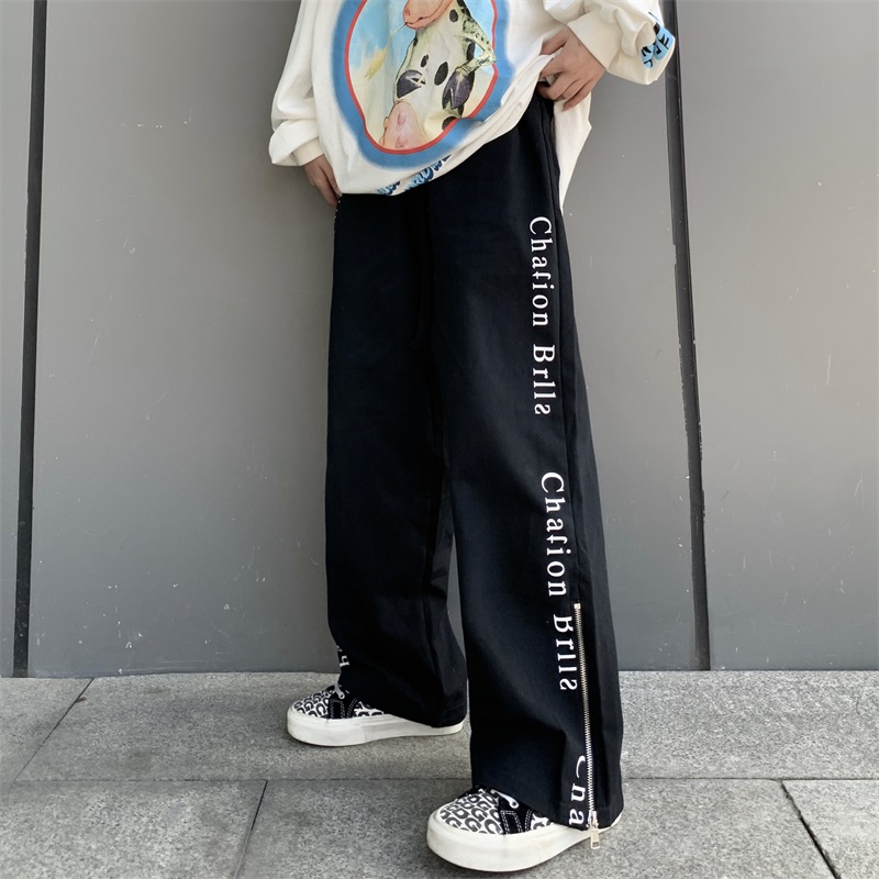 ジップスリットパンツ2色ズボンボトムスジャージロゴゴムハイウエストロングストレートワイド太いゆったり黒ブラック白ホワイトダンス衣装ヒップホップレディースメンズガールズストリートモノトーン韓