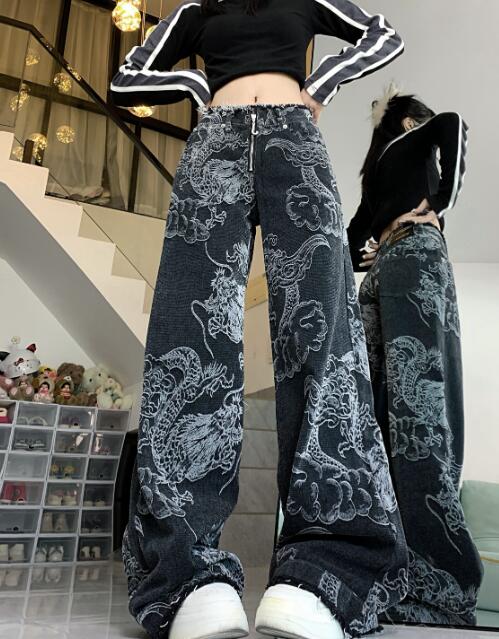 デニムズボンボトムスパンツジーンズジーパンストレート龍総柄シンプルダンス衣装ヒップホップレディースメンズガールズストリート奇抜派手韓国ビッグ大きいサイズ