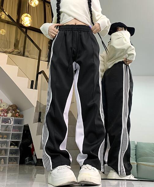 ♪M-2XL展開♪バイカラーライン切替ワイドズボンボトムスパンツジャージハイウエストゴムロングシンプル太め大きいサイズゆったりダンス衣装ヒップホップHIPHOPレディースメンズストリート奇抜派手個性