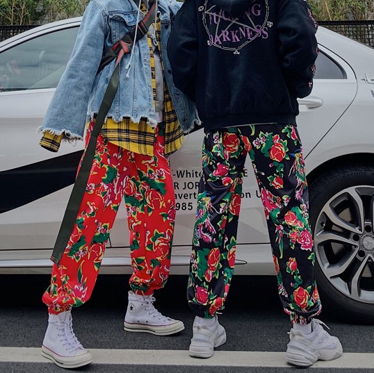 薔薇ズボン2色ボトムスジャージパンツロング黒ブラックレッド赤レディースメンズガールズダンス衣装花柄フラワーヒップホップHIPHOPストリート派手カラフル奇抜個性的ハイウエストゴムジョガーパンツ