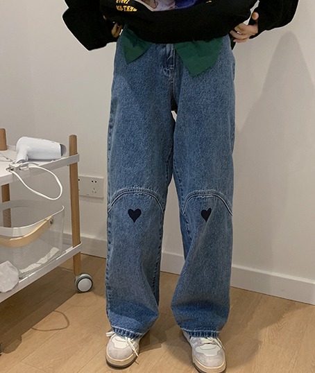 ハートデニムパンツボトムスデニムジーパンジーンズブルー刺繍ロゴワイドストレートハイウエストレディースガールズジーパンダンス衣装ヒップホップHIPHOP韓国パステル可愛いおしゃれ大きいサイズガーリー