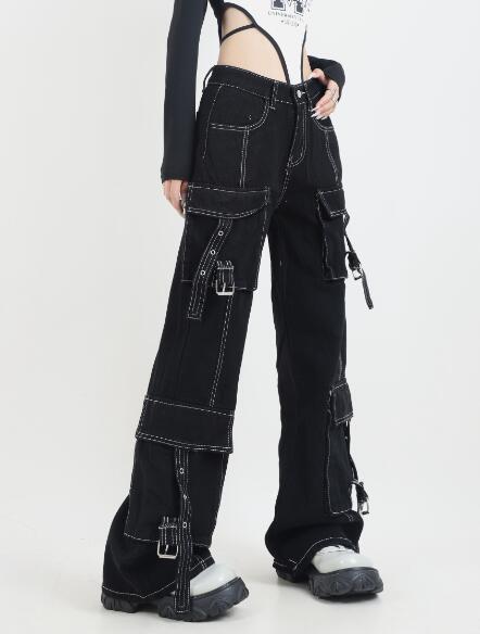 ♪-展開♪カーゴパンツジーンズジーパン パンツズボンボトムスポケットブラック黒デニムダンス衣装ヒップホップレディースメンズガールズストリート大きいサイズかっこいい個性的韓国ファッショ