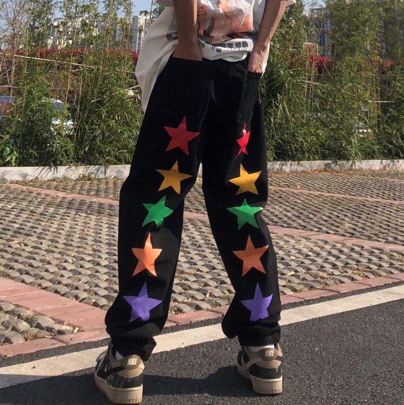 ロゴ星柄ブラックデニム黒ズボンボトムスジーンズジーパンパンツハイウエストロングストレート大きいサイズスターカラフルダンス衣装ヒップホップレディースメンズストリート奇抜派手韓国おしゃれかっこ