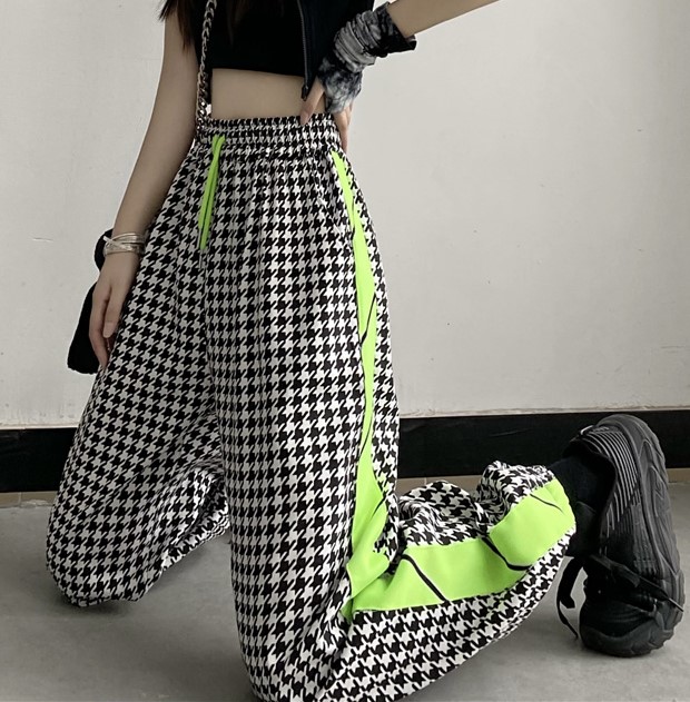 チェックラインパンツズボンボトムスロング千鳥柄ゴムワイド太いロングストレート大きいサイズジョガーパンツジャージスウェットゆったり黒ブラック緑グリーンダンス衣装ヒップホップHIPHOPレディースメンズガ