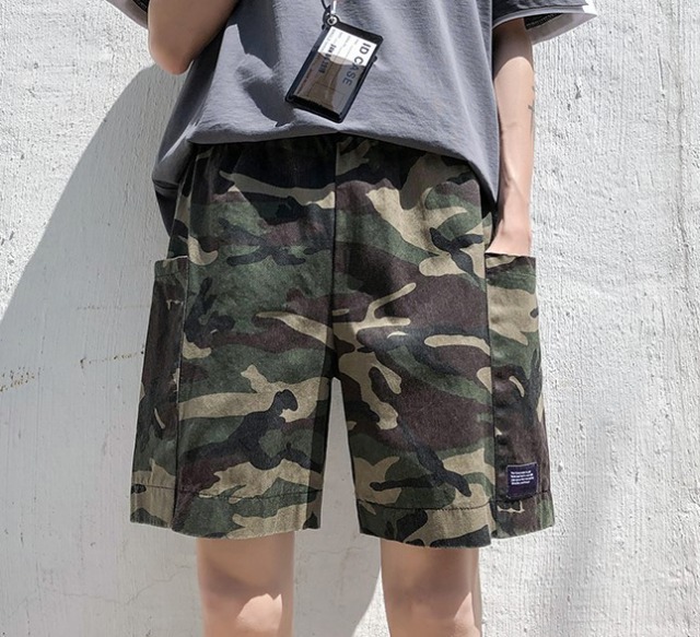 迷彩カモフラパンツズボンボトムスハーフパンツショートパンツ半ズボンメンズレディースかっこいいダンス衣装ヒップホップガールズ総柄ゴム緑グリーンひざ丈膝上太いワイド服下おしゃれ韓国